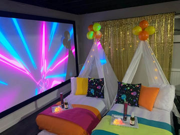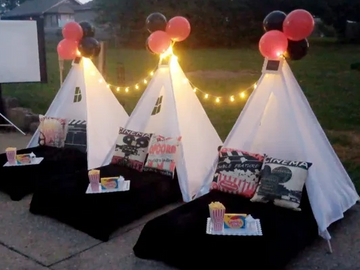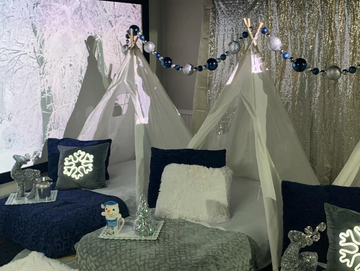 Includes: Tent, Air Mattress, Throw Pillows, Bedding, Twinkle Lights,Signage,and Decor